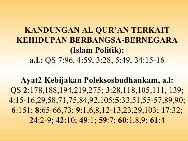7:96, 4:59, 3:28, 5:49, 34:15-16 Ayat2 Kebijakan Poleksosbudhankam, a.l: